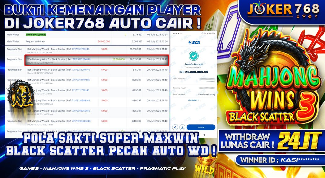 Salah satu kemenangan paling fenomenal baru-baru ini diraih oleh member dengan user ID KASI******** pada permainan Mahjong Wins 3 Black Scatter. Member tersebut berhasil membuktikan kekuatan Pola Sakti Super Maxwin dengan melakukan withdraw (WD) sebesar Rp 24.000.000 pada tanggal 09 Juli 2025. Kemenangan ini didapatkan setelah meraih total win sebesar Rp 25.500.000 hanya dalam satu putaran yang tepat.
