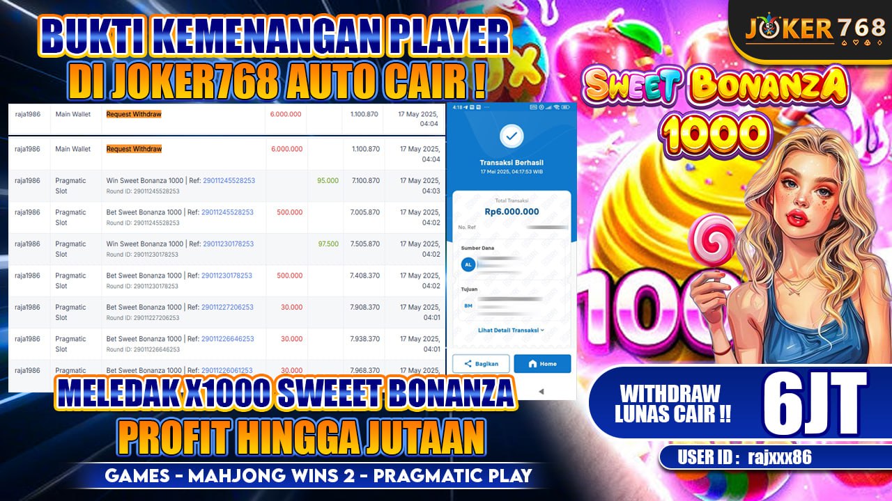 Fenomena bukti jp joker768 kembali menjadi sorotan setelah banyak player membagikan hasil withdraw lunas dari game Sweet Bonanza 1000. Game besutan Pragmatic Play ini dikenal dengan multiplier besar, scatter mudah muncul, dan peluang meledak x1000 yang membuat saldo naik drastis. Dari tangkapan layar transaksi hingga notifikasi transfer, semuanya menunjukkan satu hal: menang nyata dan auto cair.