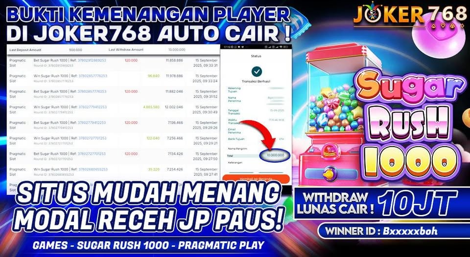 JOKER768 kembali membuktikan kualitasnya sebagai situs slot gacor terpercaya dengan menghadirkan bukti JP nyata dari game Sugar Rush 1000 Pragmatic Play. Pada momen kali ini, seorang pemain dengan Winner ID Bxxxxxbob sukses meraih jackpot fantastis senilai 10 JUTA RUPIAH hanya dari modal receh, dan yang paling krusial, withdraw langsung cair tanpa kendala. Hal ini semakin menegaskan bahwa JOKER768 WD auto cair benar-benar real dan konsisten.