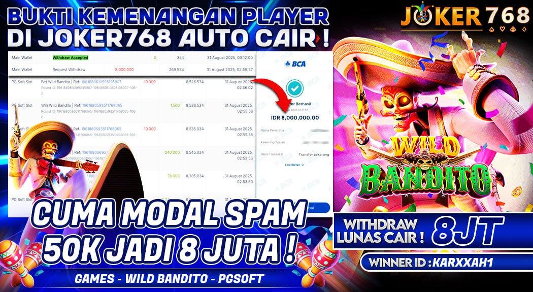 JOKER768 kembali membuktikan reputasinya sebagai situs slot gacor terpercaya dengan menghadirkan bukti kemenangan nyata dari game Wild Bandito PG Soft. Dalam bukti ini, seorang pemain dengan Winner ID KARXXAH1 berhasil mengubah modal kecil 50K menjadi kemenangan besar 8 JUTA RUPIAH, dan yang paling penting, withdraw langsung cair tanpa hambatan. Fakta ini menegaskan bahwa JOKER768 WD auto cair bukan sekadar promosi, tetapi realita yang dirasakan member.