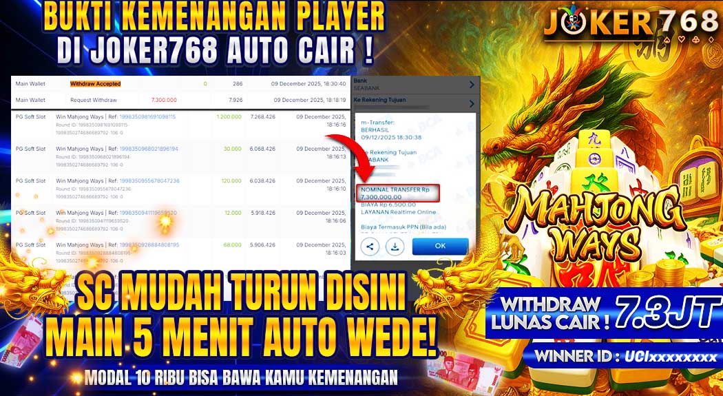 Joker768 kembali menunjukkan bukti kemenangan player melalui permainan Mahjong Ways. Seorang member berhasil melakukan WD sebesar Rp7.300.000 dengan proses pencairan yang cepat dan lunas. Riwayat transaksi tercatat jelas, membuktikan sistem pembayaran berjalan aman, praktis, dan dapat dipercaya oleh para pemain.