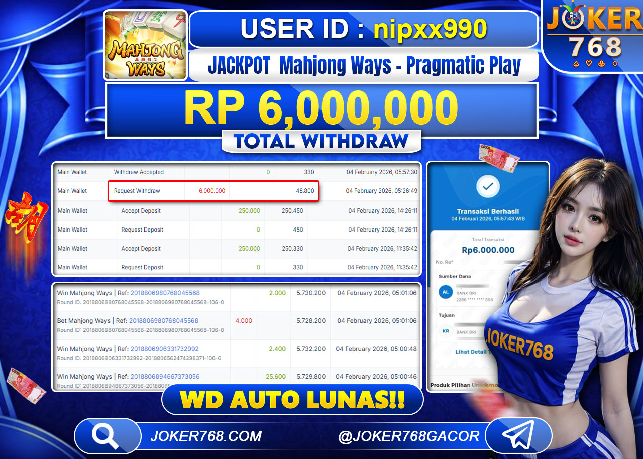 Hasil penarikan dana kembali tercatat dari permainan Mahjong Ways Pragmatic Play. User sukses melakukan withdraw sebesar Rp6.000.000 dengan proses yang berjalan cepat. Riwayat transaksi terlihat jelas dan dana diterima tanpa kendala, menunjukkan sistem pencairan yang stabil serta terorganisir.