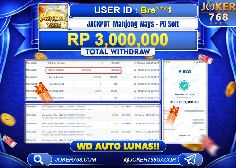 BUKTI JP JOKER768 – MAHJONG WAYS PG SOFT WD AUTO LUNAS RP 3.000.000 BUKTI JP JOKER768 – MAHJONG WAYS PG SOFT WD AUTO LUNAS RP 3.000.000