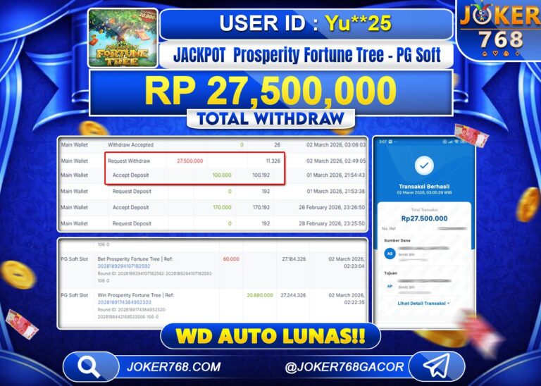 BUKTI JP JOKER768 PROSPERITY FORTUNE TREE PG SOFT WD 27.500.000 AUTO LUNAS