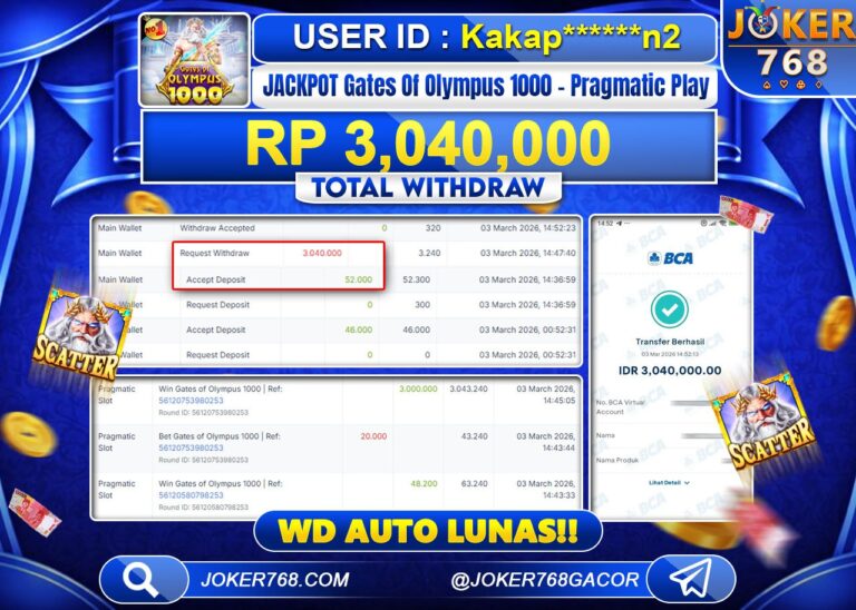 Bukti Jackpot berisi kumpulan hasil kemenangan, bukti WD, dan maxwin para pemain di JOKER768. Semua data ditampilkan melalui screenshot asli sebagai bukti bahwa JOKER768 adalah situs slot gacor dengan peluang kemenangan tinggi, proses WD cepat, dan pembayaran yang jelas tanpa drama.
